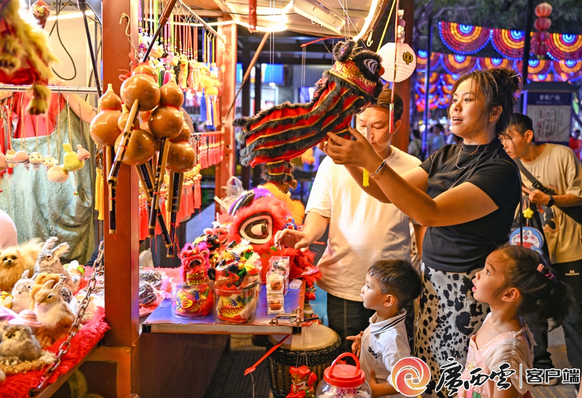 中秋、国庆期间,田阳区开展“月满中秋、双节同庆”系列活动,吸引众多游客前来品美食、赏民俗、选购特色商品。图为9月29日晚,在百色市田阳区田州古城,游客正在体验古镇风情。周加孔 摄