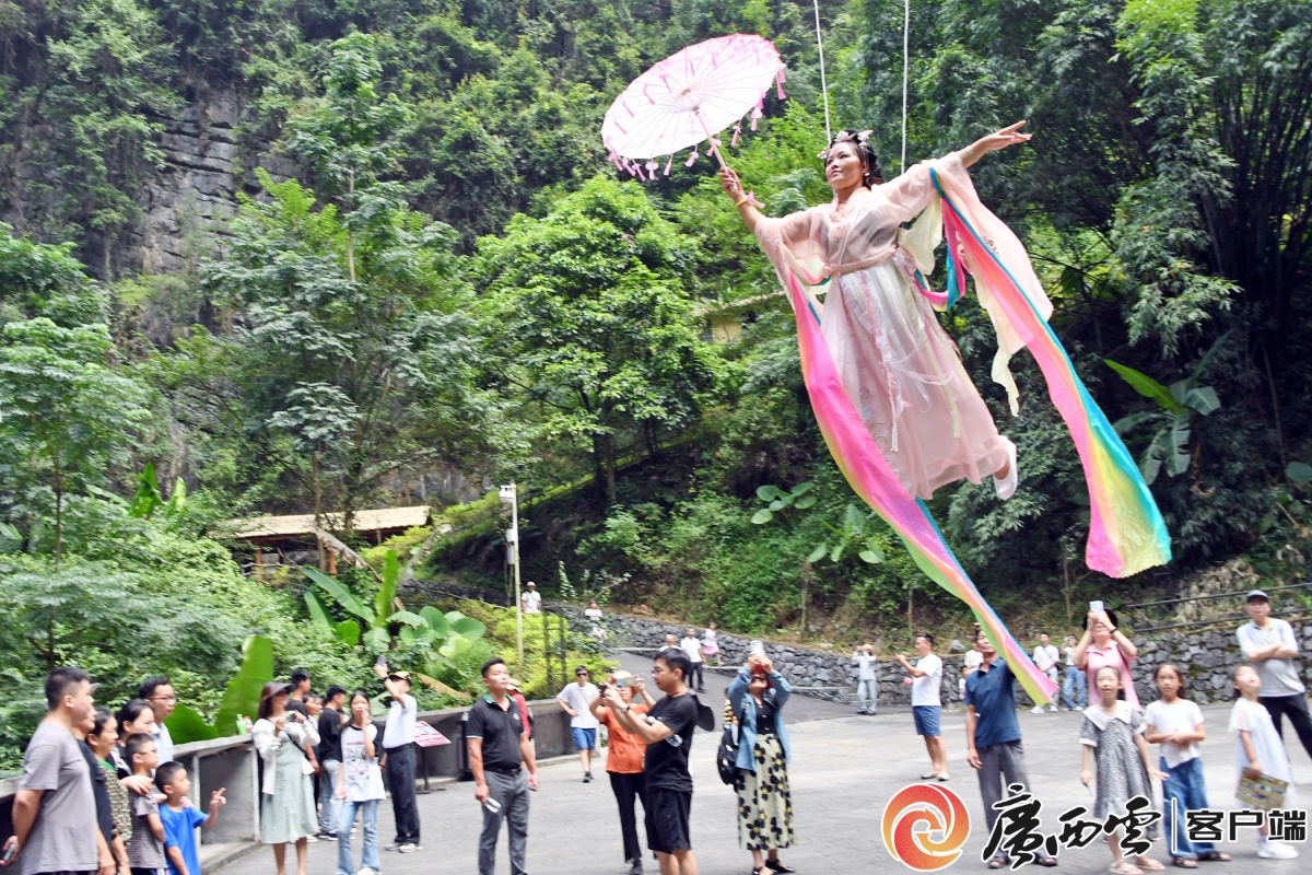 10月1日是国庆节,在罗城仫佬族自治县棉花天坑景区,游客在观赏实景演出。中秋、国庆长假期间,该县各景区推出系列优惠活动和特色旅游项目,吸引众多游客前来观光旅游。韦如代 摄