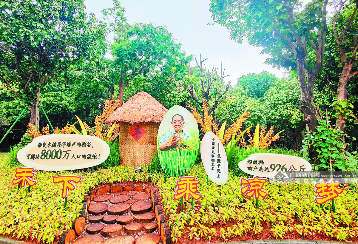 10月1日是中秋国庆假期的第三天,一大早,青秀山风景区就人气爆棚。在东盟友谊园草坪,游客被阵阵稻香所吸引——1万株水稻组成了青秀山的标志,游人穿梭其中感受自然气息,共享丰收的喜悦。草坪周围,由蔬菜、瓜果、花卉、松鼠等元素装饰的《庆丰收,促和美》《八桂丰收美如画》《“蔗”么甜蜜》等园林小品,烘托出红红火火的节日氛围。