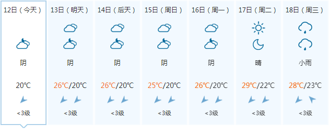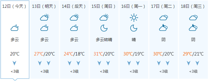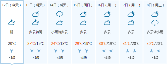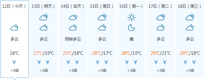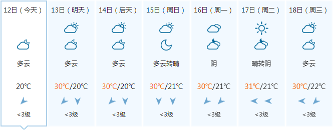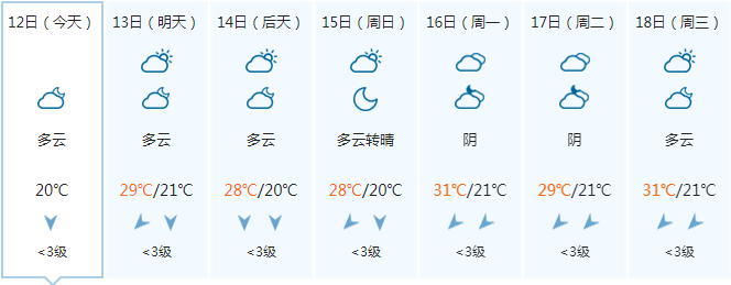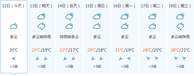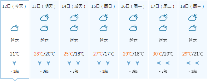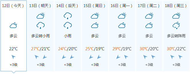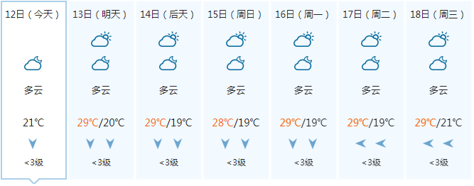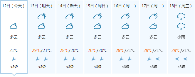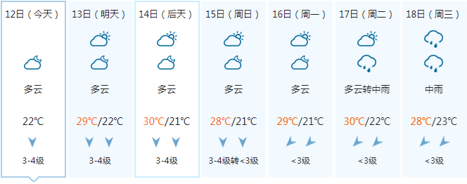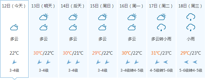 南宁市:12日晚上到13日白天,多云,东北风2级,最低气温21℃,最高气温29℃。