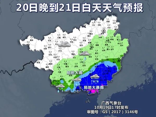 19日晚上到20日白天,玉林、北海、钦州、防城港、崇左、南宁、贵港、梧州、来宾、贺州等市和柳州、桂林两市南部有大雨到暴雨、局地大暴雨到特大暴雨,我区其它地区有小到中雨、局地大雨。桂南和沿海地区偏北风6~7级、阵风8级。