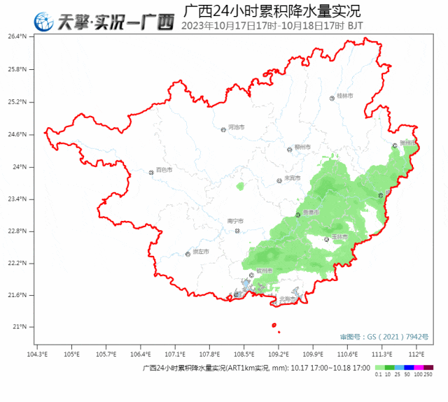 20日晚上到21日白天,玉林、北海、钦州、防城港、梧州、南宁、贵港等市有大雨到暴雨、局地大暴雨,我区其它地区有小到中雨、局地大雨。