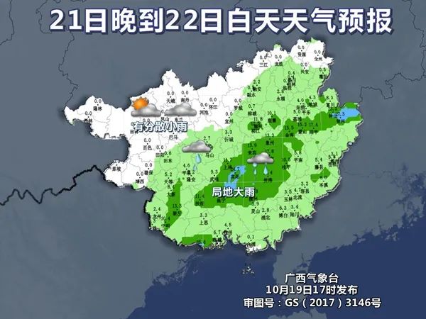21日晚上到22日白天,桂东、桂南有小到中雨、局地大雨,我区其它地区多云到阴天有分散小雨。