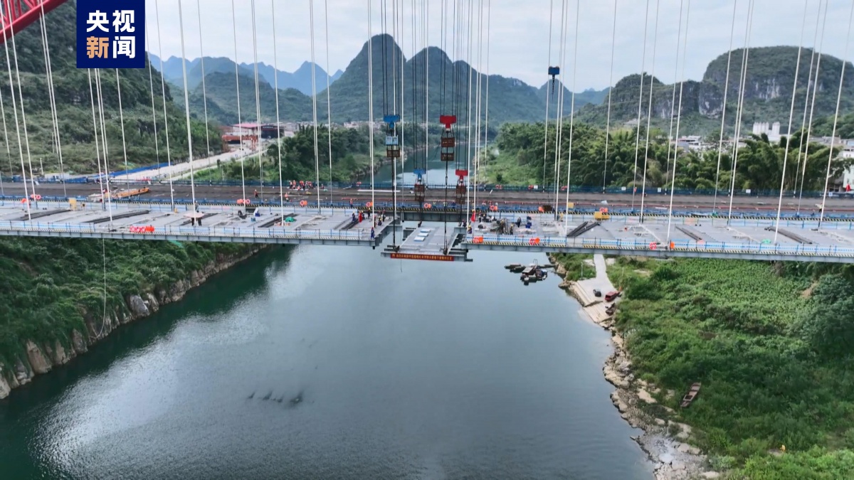 10月23日,随着连接线桥桥面最后一片格子梁精准就位,广西武忻高速新圩红水河特大桥整体合龙,形成双龙齐飞红水河上的壮观景象,标志着新圩红水河特大桥主桥桥面实现贯通,钢结构施工即将全面完成。