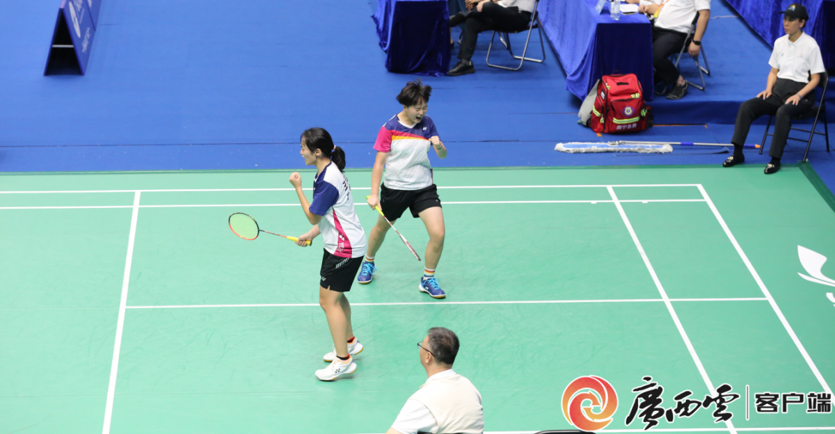 广西队运动员王景钰、王玉铭在比赛中庆祝得分。