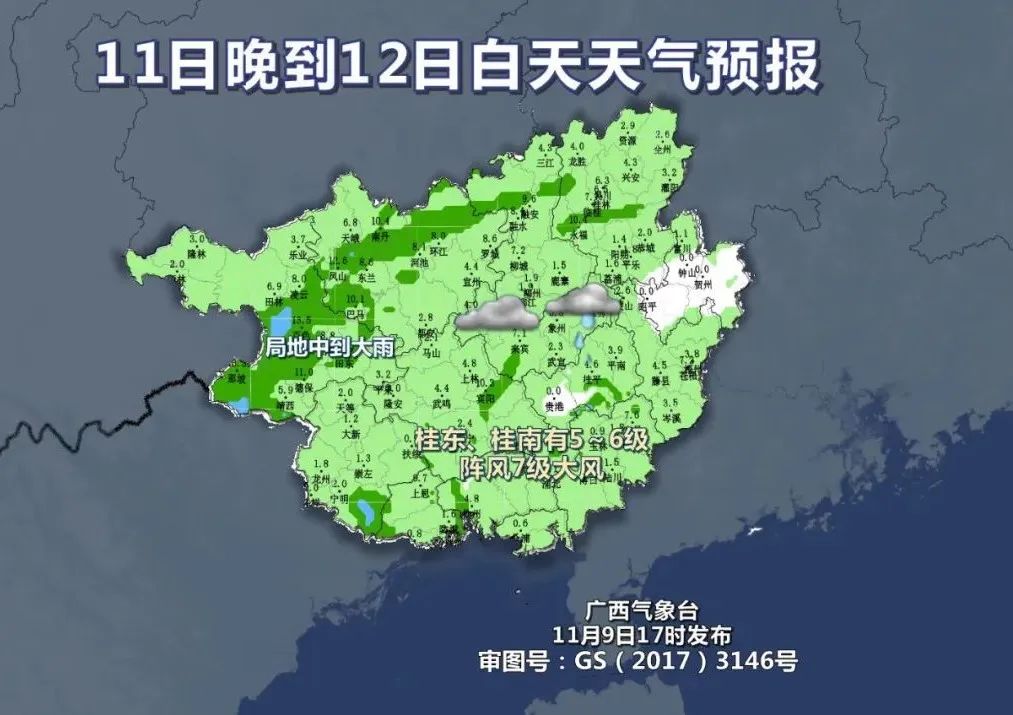11日,桂北有小到中雨、局地大雨,桂南阴天有小雨。各地气温:桂东北12~19℃,其它地区17~29℃。
