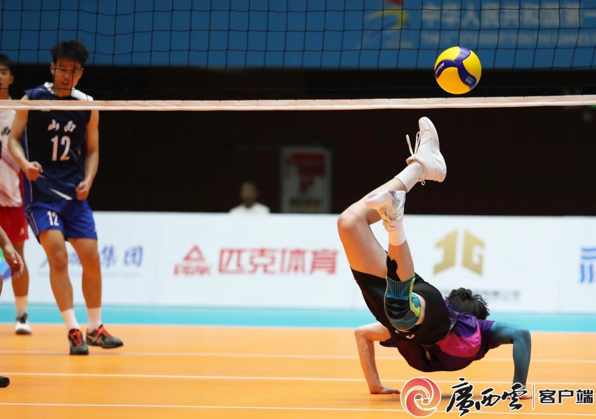 11月11日,排球大学男子组比赛进入第四天。图为四川队队员在鱼跃救球。