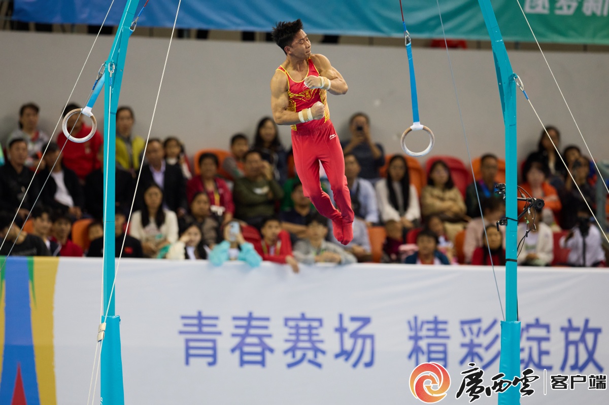 11月12日下午,来自昆明的杨春杰在男子甲组吊环决赛中胜出,获得该项目金牌。