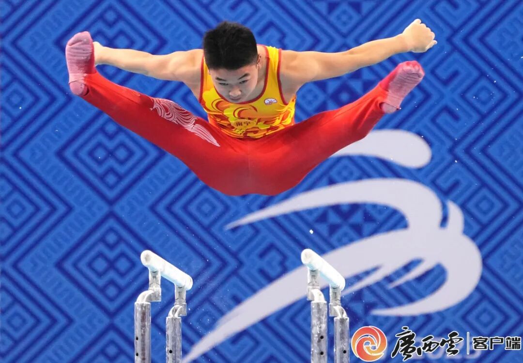 11月8日,首届学青会男子体操乙组决赛在南宁举行,图为南宁队选手在双杠比赛中。广西日报-广西云客户端记者 周军 摄