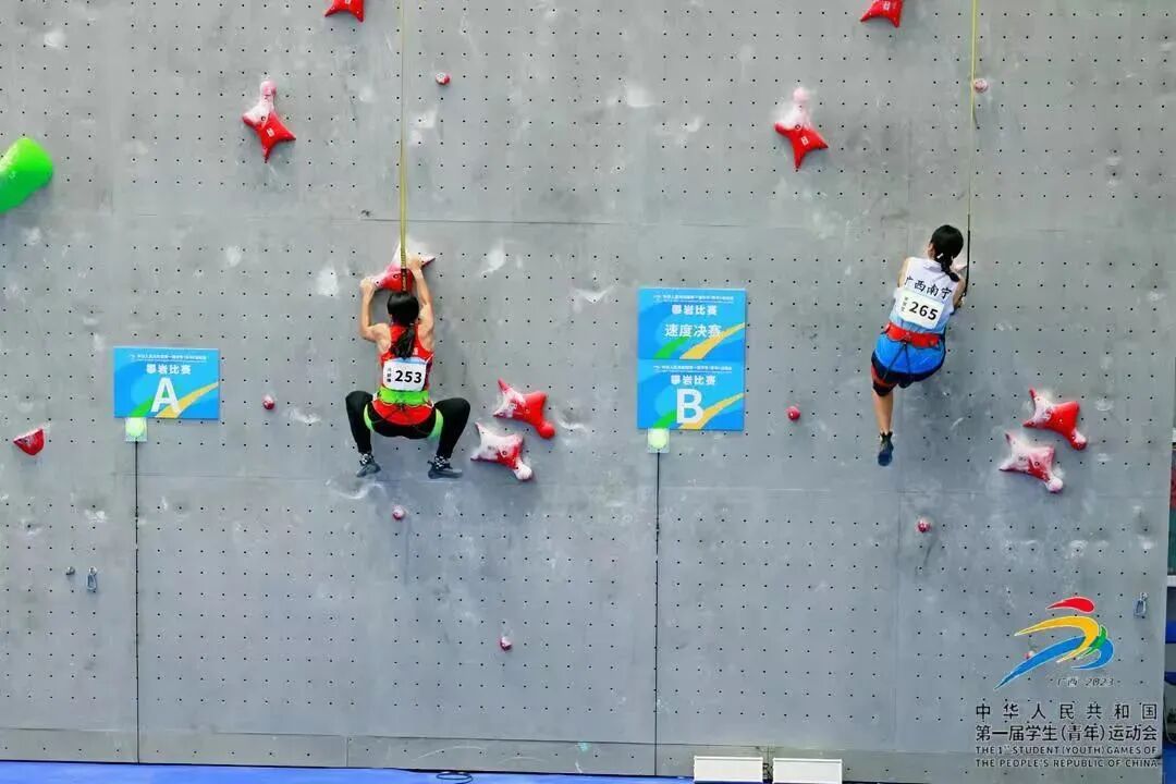 首届学青会攀岩比赛在马山县古零镇初级中学攀岩馆举行。图为比赛现场。图源马山县融媒体中心