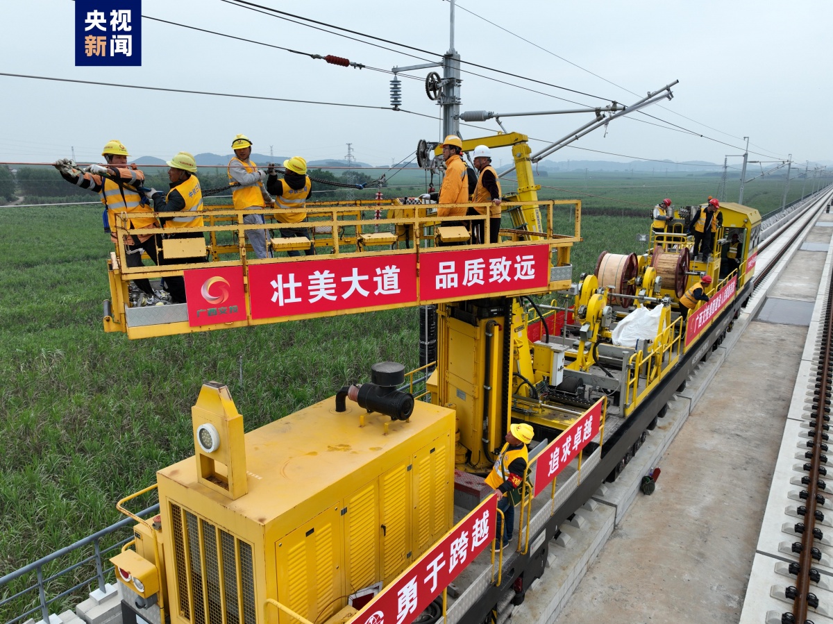 南深高铁南玉段开始架设接触网导线