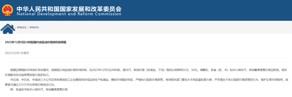 根据近期国际市场油价变化情况,按照现行成品油价格形成机制,自2023年12月5日24时起,国内汽、柴油价格(标准品,下同)每吨分别降低55元、50元。调整后,各省(区、市)和中心城市汽、柴油最高零售价格见附表。相关价格联动及补贴政策按现行规定执行。