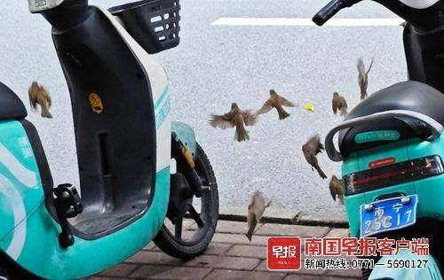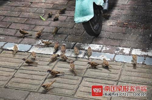 在南宁市青秀区竹园路的一排商铺前,每天有数十只麻雀定时来觅食,商铺店主也按时给麻雀喂食,这一有趣现象引来市民围观。