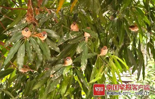 ▲隐藏在绿树中的麻雀。记者 何定坚 摄
