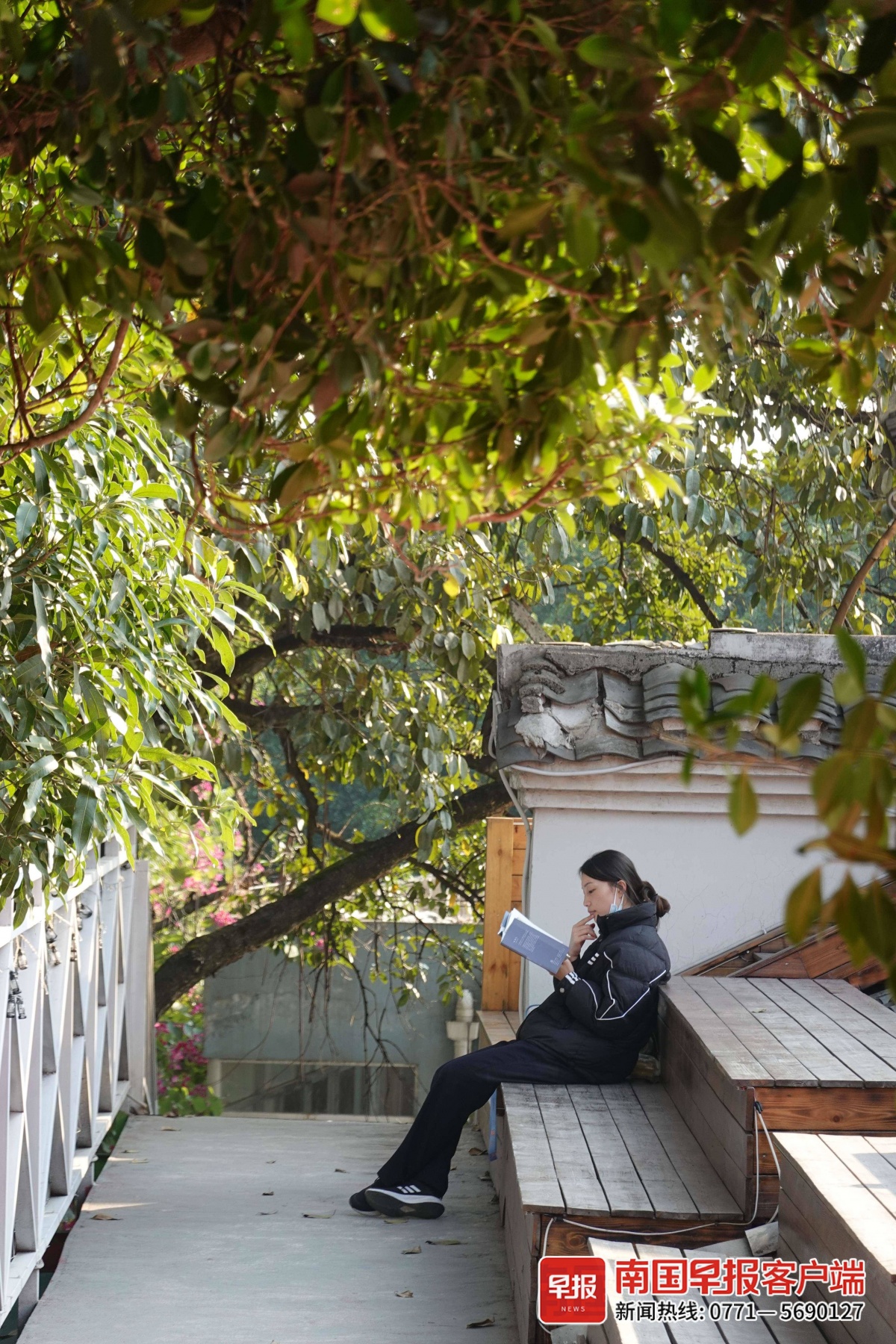 ▲12月29日上午,南宁市天气晴朗,市民在露台上看书。