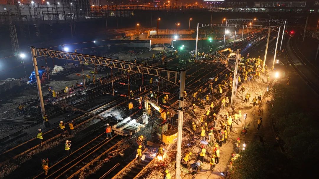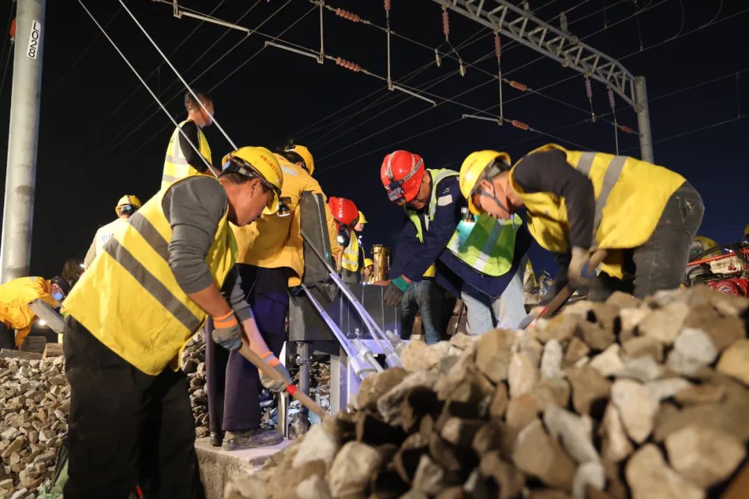 当晚,国铁南宁局各站段参与现场施工配合及监控人员约100名,施工单位共投入劳力500余名,安全、精准、快速完成了拆除线路及异地长距离推送整组道岔插铺任务,创造了国铁南宁局在大型高铁客站插铺道岔施工用时最短新纪录。