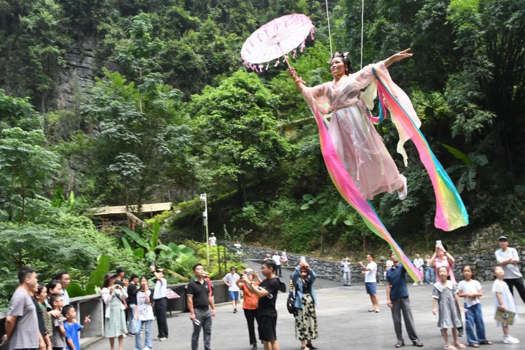 游客在罗城棉花天坑景区观看威亚表演《美丽的神话》。韦如代 摄