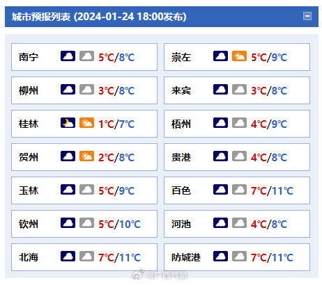 1月24日晚上到1月25日白天,全区阴天,高寒山区和桂林、柳州、河池、百色等市局地有冰冻和道路结冰。最低气温:高寒山区-10~-1℃,桂东北-1~4℃,其它地区4~8℃。
