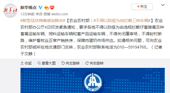 农业农村部:不得以防疫为由拦截三种车辆