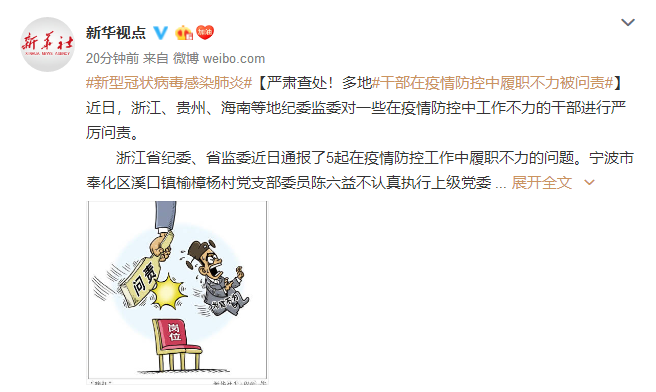 近日,浙江、贵州、海南等地纪委监委对一些在疫情防控中工作不力的干部进行严厉问责。