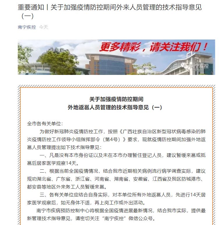 二、根据当前全国疫情情况,结合南宁市近期相关病例流行病学调查实际,建议规劝湖北省、广东省、浙江省、河南省、湖南省、安徽省、江西省及我区防城港市、都安瑶族自治县等地区外来务工人员暂缓来邕。