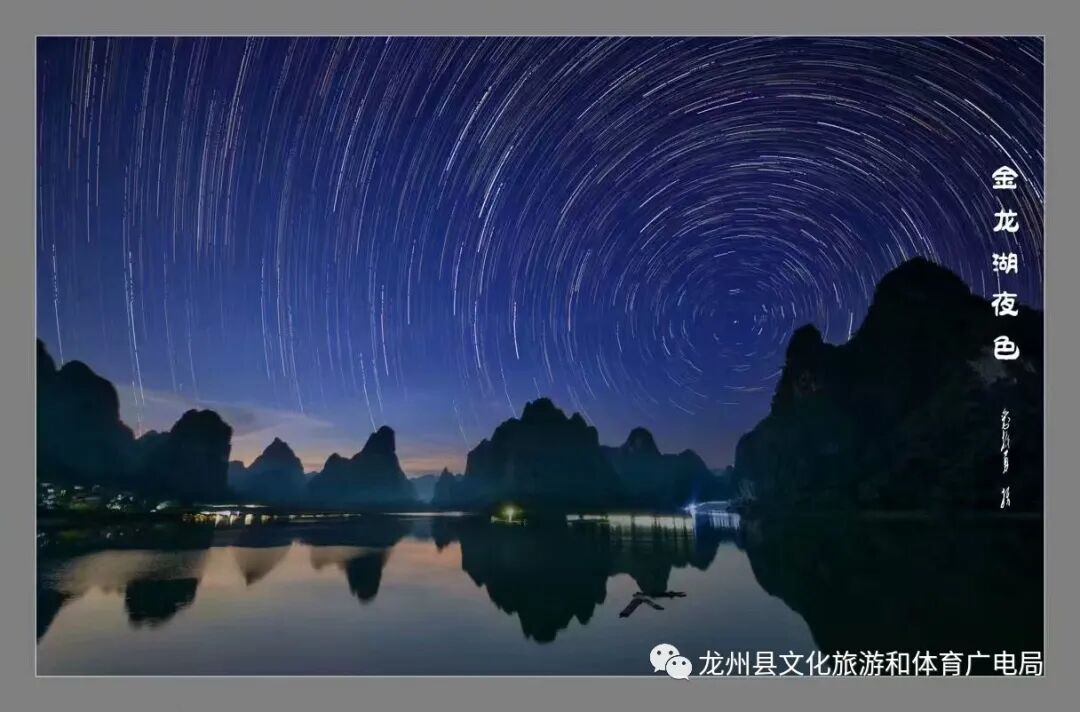 夜色,璀璨的星辰环绕山峦,坠入湖中令人觉得是在天宫仙境。