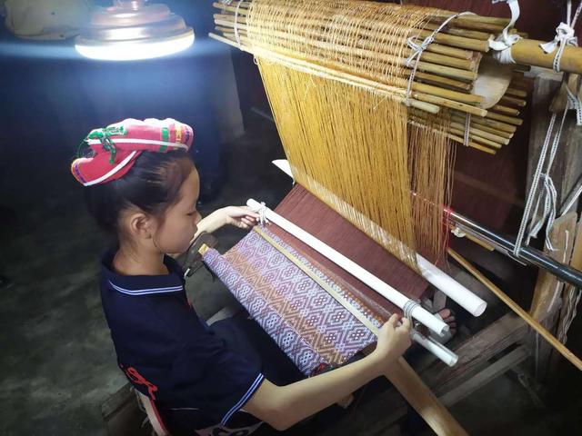 12岁“小织女”潘俊欣在课余时间帮助母亲织壮锦
