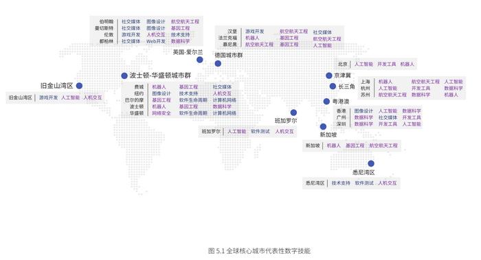 通过计算26个城市中人才的基础性和颠覆性技能的相对渗透率,报告发现同时具备基础性数字技能和颠覆性数字技能优势的城市群包括:波士顿-华盛顿城市群、旧金山湾区、英国-爱尔兰城市群、悉尼湾区、印度班加罗尔。而在颠覆性数字技能上具有优势的地区包括:德国城市群、京津冀城市群、长三角城市群、新加坡。