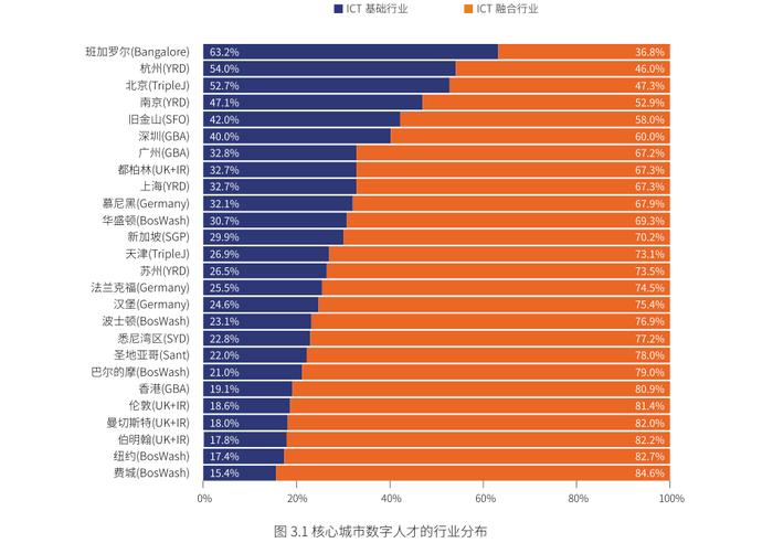 在ICT融合行业中,数字人才占比最高的行业主要有:制造、医疗、金融、公司服务、消费品、教育、媒体通讯。制造业具有突出数字人才优势的地区有德国慕尼黑、汉堡和法兰克福三大城市群、中国长三角地区的上海、杭州、南京、苏州;金融行业具有突出数字人才优势的地区有纽约、伦敦、都柏林、新加坡、悉尼湾区、上海;医疗行业具有突出数字人才优势的地区有波士顿、费城和旧金山;消费品行业具有突出数字人才优势的地区有杭州、香港、深圳和广州。