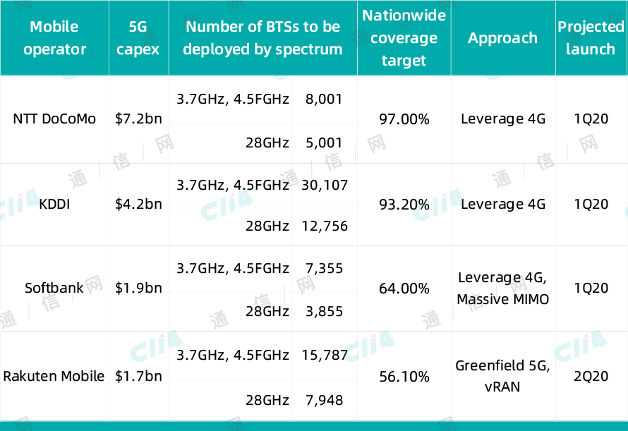 基于运营商的五年期5G网络部署计划,总务省在2019年4月向NTT DoCoMo、KDDI、软银和Rakuten Mobile颁发了5G服务和频谱牌照。这些网络部署计划包括有关基础设施投资额、基站收发台(BTS)部署、部署预测和全国网络覆盖目标的信息。