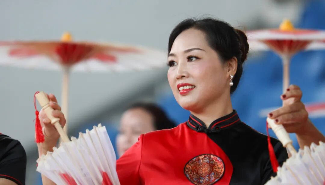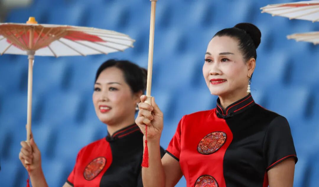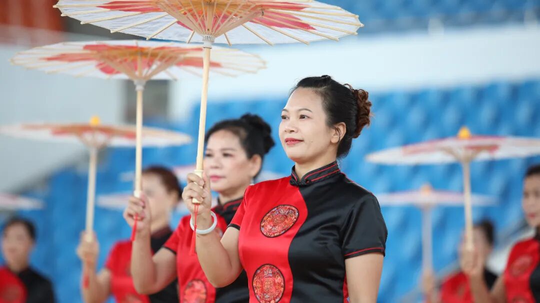 在龙州本土原创歌曲《木棉花英雄花》的背景音乐下,20名旗袍队员缓缓登场,这首本土音乐恢弘大气,极其穿透力,加上红黑线条的旗袍服结合,画面感非常强烈。只见队员们手持透明的花丝伞,整齐演绎换位交错、穿插等立体变化。形成了虚实相衬、快慢有度的经典旗袍秀表演艺术,给人予震撼的艺术冲击力。