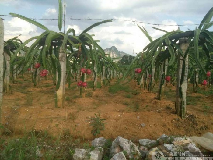 上金乡嘉信火龙果产业园,位于龙州县东南部,这里光照充足,明江、丽江两条江水贯穿全乡,沿江两岸,风景优美,得天独厚的环境条件让这里成为热带水果种植的摇篮。嘉信火龙果产业园占地面积3800亩,依托广西农科院的技术力量和科技资源,与台湾金都农业发展有限公司建立合作关系,采用“公司 基地 农户”的模式,与贫困户结成生产、加工、销售一体化的经济实体,带动当地村民在家门口就业,其中,贫困户60人,实现资源共享、优势互补,着力打造桂台观光扶贫农业产业园。目前,园区内主要种植“金都一号”火龙果,亩产量3-4千斤,年收益3000千多万,火龙果成为了村民脱贫致富的“吉祥果”。