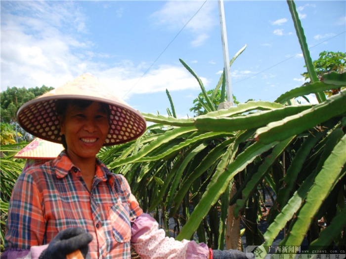 在农美娇的身后,是翠绿成片的火龙果种植园,果树生长旺盛,肉茎粗壮,队形整齐。放眼望去,仿佛火龙果树大阅兵,蔚为壮观。工人们穿梭其中,手提桶篮,脸上洋溢着幸福的喜悦。