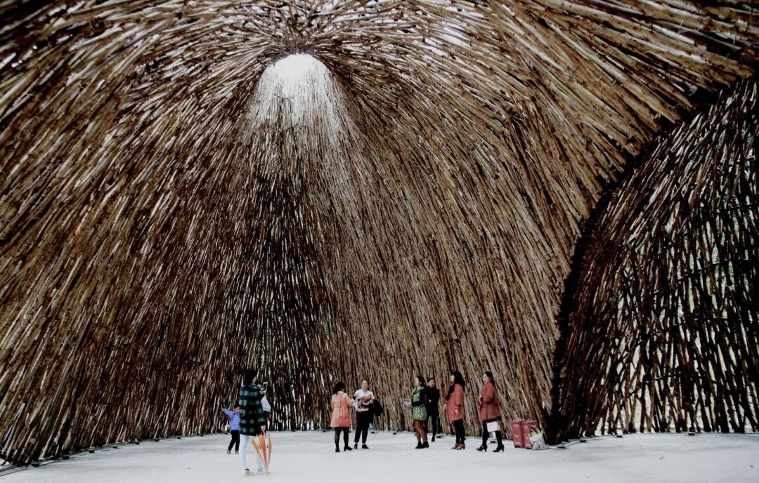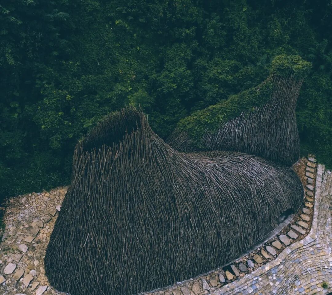 近看,大门为鸟巢结构,是树枝一枝一枝搭建而成。置身于“鸟巢”的内部,阳光透过缝隙在地上洒下光斑,自己就好似变成一只幼鸟,跃跃欲飞想要探寻森林的奇妙,已然忘我。