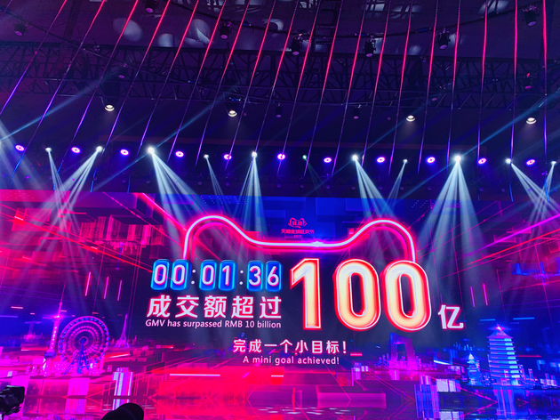 新浪科技讯 11月11日凌晨消息, 第十一届阿里巴巴天猫双11于今日凌晨正式打响。据双11实时交易数据显示,在开场的1分36秒,交易额超100亿元。