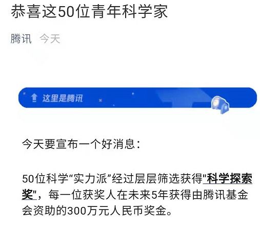 腾讯表示,50位获奖人每位都将在未来5年获得由腾讯基金会资助的300万元人民币奖金。