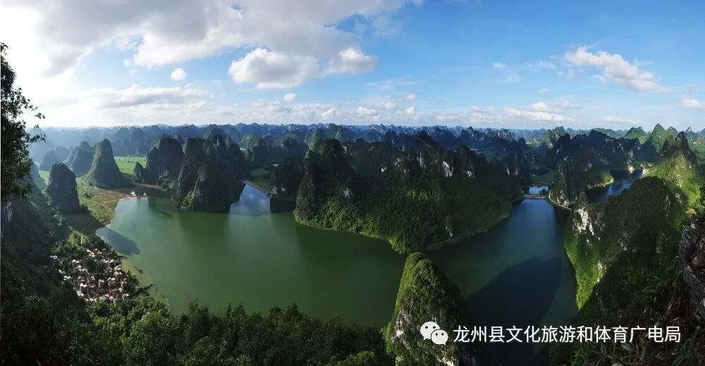 金龙湖距龙州县城53公里,位于金龙镇以南2公里处,湖面干净整洁,面积2000亩左右,蓄水量高达1300平方米。如果从地图上看金龙湖,宛如一颗璀璨的绿宝石,镶嵌在中越边境线上。