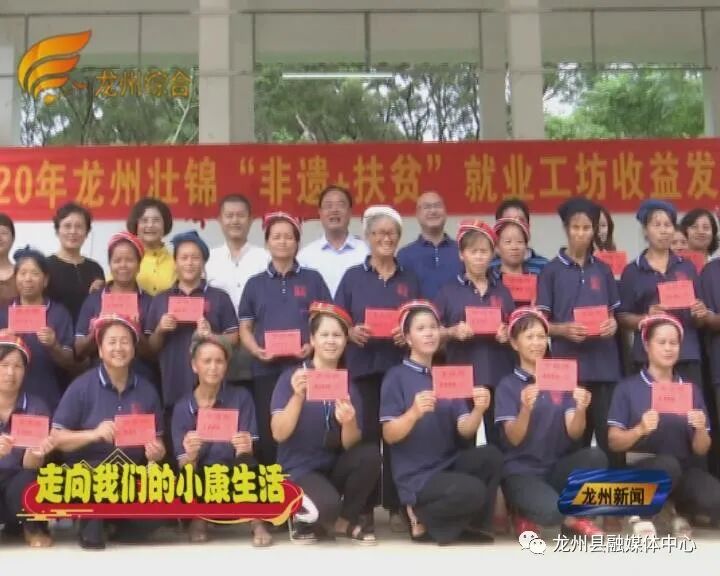 美丽壮锦代代相传,非遗扶贫喜结硕果。2018年6月,龙州壮锦技艺工坊喜获国家文化和旅游部、国务院扶贫办支持的全国首批10个“非遗+扶贫”就业工坊之一。2019年,龙州壮锦“非遗+扶贫”就业工坊累计培训群众学员90名,其中建档立卡贫困户35名,占比38.9%,给织娘们带来收益31万元。特别是在今年抗击新冠肺炎疫情的特殊时期,就业工坊的织娘们居家织壮锦,农务与织锦两不误,第二季度收益达到了14.7万元。