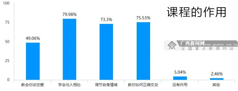 在“关于恋爱课程你认为它有什么作用?”的选项中,有79.98%的学生选择“学会与人相处”。