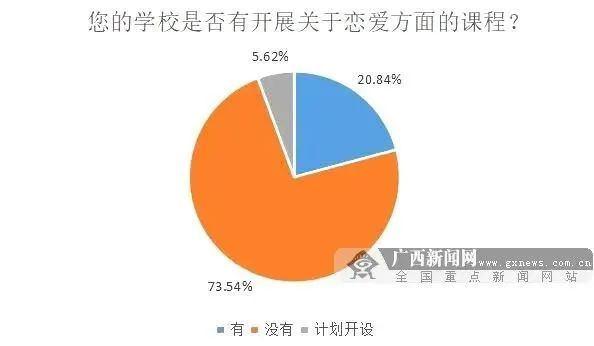 根据记者发放的调查问卷显示,参与调查的学生中,有73.54%所在学校并未开设恋爱课程;学校已开设恋爱课程的,占20.84%,还有5.62%的学校正在计划中。记者在采访中了解到,广西很多高校尚未开设恋爱课程,即便在已经开设相关课程的高校,也鲜少有独立开课的,很多是在某些大类课程中,包含了涉及恋爱或者婚姻的章节。比如南宁师范大学开设了《婚姻家庭继承法》、《家庭教育学》、《婚姻与家庭治疗》等专业或选修课程,里面有涉及婚恋的内容;桂林理工大学面向大一学生开设的《大学生心理学》课程中,有涉及大学生恋爱心理和性心理的内容,涉及4个学时;与其情形差不多的广西机电职业技术学院开设了《大学生心理健康教育》里面有三个章节涉及“恋爱与性 ”……