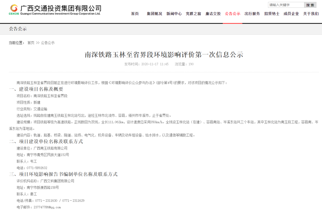 11月17日,广西交通投资集团有限公司官网发布《南深铁路玉林至省界段环境影响评价第一次信息公示》。大家关心的南深高铁(玉林至省界段)又有新进展:将在广西设玉林北站(在建)、容县南站、岑溪东站共三个车站。