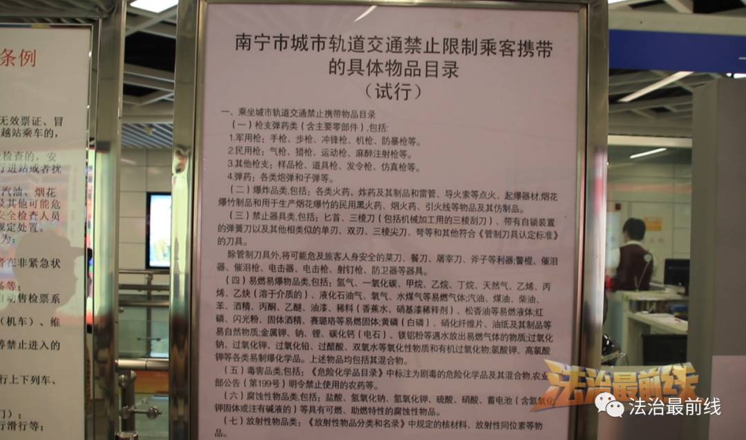 在安检入口处,立有一块《南宁市城市轨道交通禁止限制乘客携带的具体物品目录》宣传牌,里面共罗列了10类禁止限制乘客携带物品,包含枪支弹药、爆炸品、管制刀具、易燃易爆品等,并没有看到禁止携带胰岛素注射器进站的规定。