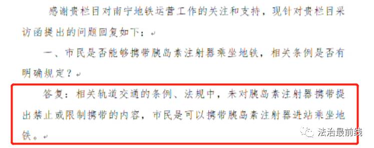 随后,记者向南宁轨道交通集团发了一封采访函,希望对方就“市民是否能够携带胰岛素注射器乘坐地铁,相关条例是否有明确规定”若有禁止携带胰岛素注射器相关条例,执行标准和条件是什么?”等问题做出回复。