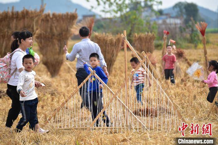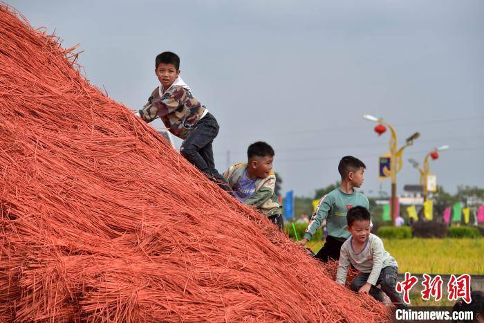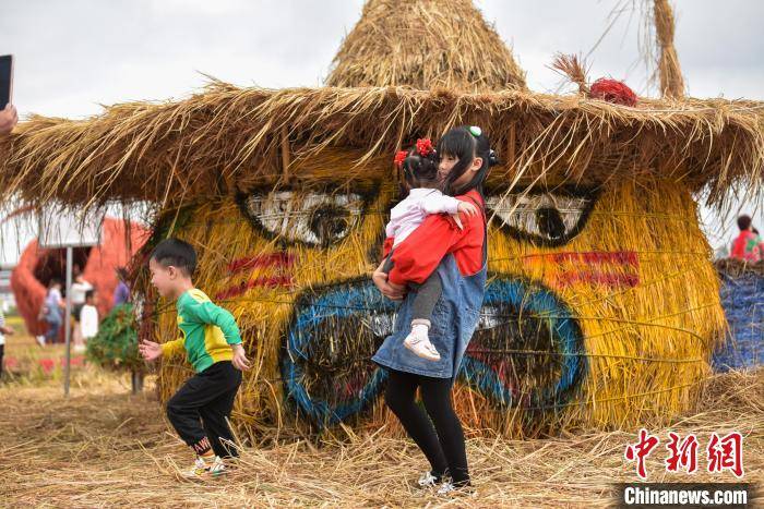 一群儿童在水稻秸秆制成的雕塑上玩耍。