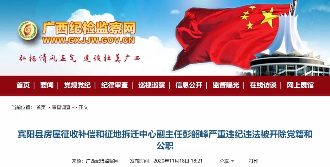 宾阳县房屋征收补偿和征地拆迁中心副主任彭韶峰严重违纪违法被开除党籍和公职