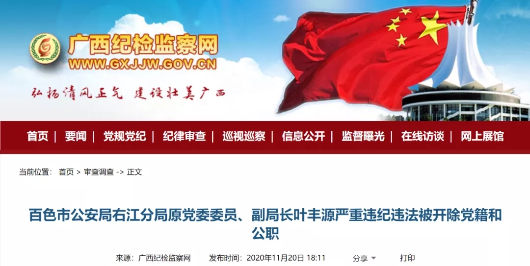 百色市公安局右江分局原党委委员、副局长叶丰源严重违纪违法被开除党籍和公职