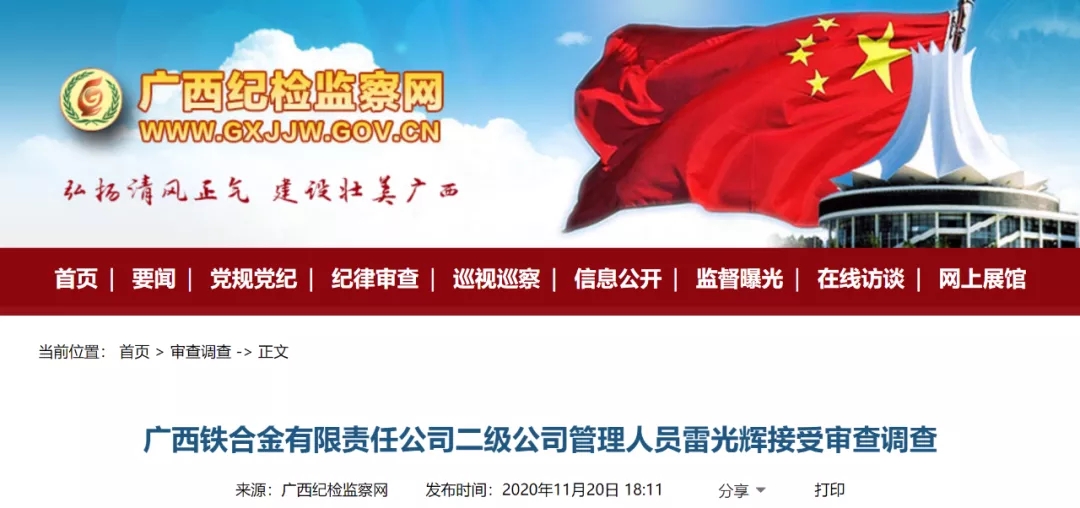 广西铁合金有限责任公司二级公司管理人员雷光辉接受审查调查