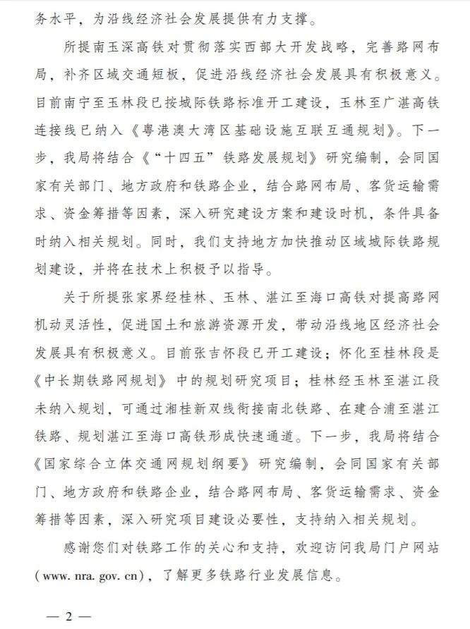 对十三届全国人大三次会议上,代表们提出的《关于将南玉深高铁和张家界经桂林、玉林、湛江至海口高铁列入国家中长期铁路网规划的建议》(第8454号),国家铁路局近日作出了答复。