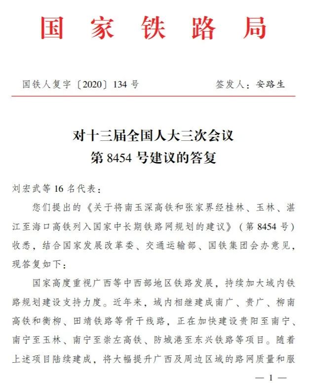 代表建议:将南玉深、张海高铁列入国家规划!国家铁路局回复了