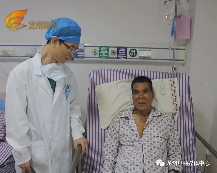 (医患对话)刘鼎麟医生:烟酒最好戒了,然后饮食要规律,早餐一定要吃啊,要规律的,要定时。(手术第一天就下床了?)何建标:第一天它是一个24小时这样(你感觉到我们的医生技术好不好呢)何建标:点个赞!(你知道他是从哪里来的吗?)我就是听说是广东那边对口支援我们龙州的。